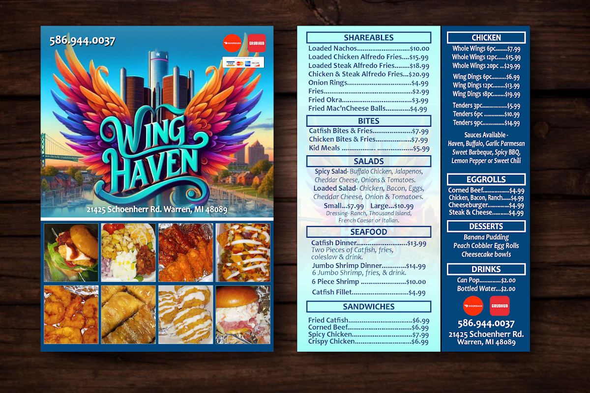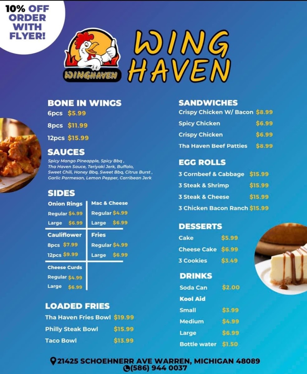 If you're in the mood for a delicious, mouthwatering meal, Wing Haven Menu has you covered. Nestled at 21425 Schoenherr Rd in Warren, MI, this spot is the perfect place to grab a tasty bite with friends or family. Whether you're craving crispy wings, savory sides, or something light to start your meal, there’s plenty to choose from. With a variety of flavorful sauces and seasonings to satisfy every palate, Wing Haven brings something for everyone - whether you're into bold and spicy or prefer a milder, tangier kick. The menu offers a cozy, no-frills dining experience, ideal for enjoying comforting food that’s always fresh and full of flavor. Each item on the menu is carefully crafted, ensuring your meal is just as satisfying as the last. If you’re in the area, you won’t want to miss out on this local favorite!